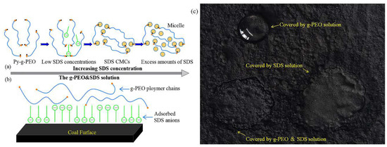 Figure 1. Principle of solution action and actual permeation: (a) Schematic overview of the industrial-grade polyethylene oxide (g-PEO) and sodium lauryl sulfate (SDS) solution; (b) schematic overview of dust control by the g-PEO&SDS solution; (c) penetration test of coal dust control in solutions containing SDS, g-PEO and g-PEO&SDS [32].