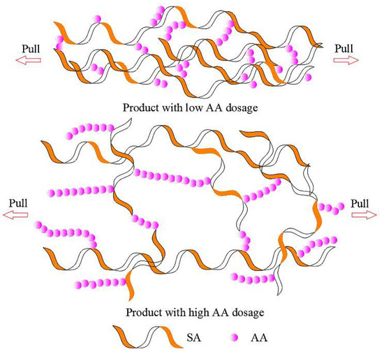 Past literature has also explored polymer emulsions other than polyurethane. Song et al. [72] first mixed styrene-acrylic emulsion with water and then added silica powder, Portland cement and flame retardant solid powder to synthesize a new sealing material. The results showed that the sealing material with 11 wt.% complex flame retardants (composed of aluminum hydroxide and chlorinated paraffin at a ratio of 3:8) had good performance when the retardants were. The tensile strength of this gas sealing material exceeds 2.25 MPa and the flame resistant property conformed to the safety standards of coal mines. Twardowska [73] has long shown that full mixing of fly ash and water has a higher air barrier effect than natural sealing materials. Su [74] first mixed cement and ethylene-vinyl acetate (EVA) copolymer emulsion with five kinds of industrial waste powder separately and then added water and defoamer to synthesize five kinds of fireproof materials. The five types of industrial wastes included fly ash (CFA), construction and demolition wastes (C&D waste), ferronickel slag (FNS), steel slag (SS) and red mud slag (RS). In the solution, EVA polymer is adsorbed on the surface of inorganic particles. As cement hydration gradually consumes interstitial water, the consolidation of polymer particles begins to form interlaced membranes, fill pores and cracks and wrap hydration products and aggregates [75]. This organic network ensures the compactness and overall microstructure of sealing materials. The permeability test and mechanical property test showed that the five materials have 3–4 orders of magnitude less permeability than the traditional materials and have good tensile strength. On the one hand, they depend on the high pozzolanic activity of the waste materials; On the other hand, they are affected by the film-forming properties of polymers (Figure 18). The air permeability coefficient, tensile strength and elongation at break of the best fly ash products were 4.17 × 10−8 m2/s, 2.14 MPa and 48.90%, respectively.