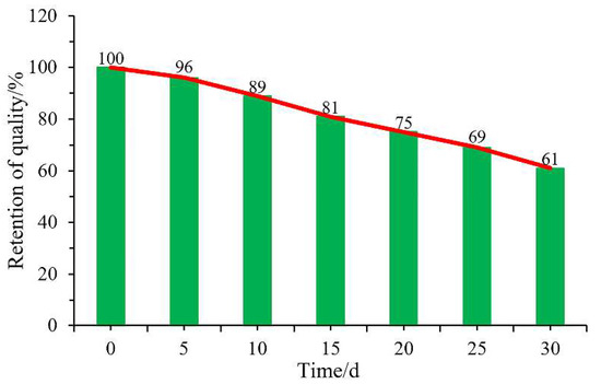 With the development of polymer-containing soft matters, some researchers have brought the concept of green environmental protection into the field of dust control. Zhou et al. [34] used sodium alginate as a matrix, because of its excellent hydrophilicity, viscidity, stability, low price, safety and non-toxicity, then chemically modified by graft copolymerization technology to synthesize an environmentally friendly dust suppressant under certain conditions. Caprolactam (CPL) and acrylic acid (AA) were selected as graft monomers. The results of a morphology test, contact angle analysis, sinking test, viscosity test and tensile test show that the new product had excellent viscosity, wettability, strength and deformation ability (Figure 2). The raw material is clean, the cost is low and the preparation is simple. As a natural, non-toxic and biodegradable polymer material, Zhang [35] modified guar gum (GG) with cyanuric chloride (TCT) and sodium sulfamate (SS) to form the modified product GGTCS (Figure 3). Thermogravimetric analysis showed that the thermal stability of the modified GGTCS increased from 268 °C to 285 °C. Using GGTCS as the main material, a new dust reducer of 0.8% GGTCS + 1.5% glycerol (GLY) + 0.1% sodium dodecyl benzene sulfonate (SDBS) + 0.02% fatty alcohol polyoxyethylene ether (AEO) was synthesized. It had good water retention and viscosity. When the coal dust was sprayed, the solidified film formed on the surface of the coal dust could bear up to 29 kPa of pressure. The solidified film can be buried in soil, with the quality reducing by 60% after one month (Figure 4). It also has good degradability characteristics.