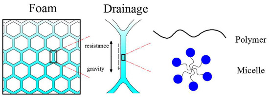 The efficiency of foam dust suppression is related to foam properties, which is characterized by stability, adhesion, wettability, initial liquid fraction and bubble size. Wang et al. [37] synthesized six test solutions by adding hydroxyethyl cellulose (HEC), polyacrylamide (HPAM) and polyvinyl alcohol (PVA) into two foaming agents, sodium alpha-olefin sulfonate (AOS) and polyoxyethylene octylphenol ether-10 (OP-10), respectively. The properties of the foam (wettability, surface viscosity and stability) were characterized by measuring the contact angle, viscosity modulus and foam discharge rate. It was indicated that adding polymers to AOS (OP-10) decreased the wettability of the foam, especially when more than 0.3 wt.‰. However, the polymers increased foam stability and foam surface viscosity. This was due to the two macromolecular chains, micelles and aggregates which existed in the liquid phase when the polymer dissolved in the surfactant solution, significantly increasing the viscosity of the liquid. The viscous force increased the strength of the foam liquid film, slowing down the foam discharge and increasing the stability of the foam (Figure 6). With the increase of polymer concentration, the effect was more obvious. Therefore, the low concentration of the polymer (0.1–0.3 wt.‰) has a better effect on the dust suppression ability of the foam.