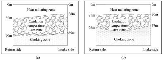 Figure 13. The variety of the three zones after injection of compound material into the goaf of the working face: (a) Before injection; (b) after injection [54].