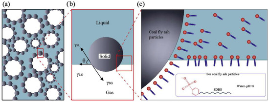 Figure 15. A structure model of three-phase foam to attach fly ash (FA) particles at the N2-water interfaces by tuning their surface-wetting properties: (a) Schematic illustration of the stabilization of gas bubbles with fly ash particles; (b) the adsorption of partially lyophobic FA particles at the gas–liquid interface, illustrating the balance in tension responsible for the attachment of particles; (c) a possible approach used to tune the wetting properties of originally hydrophilic particles by the absorbed sodium dodecyl benzene sulfonate (SDBS) molecules [63].