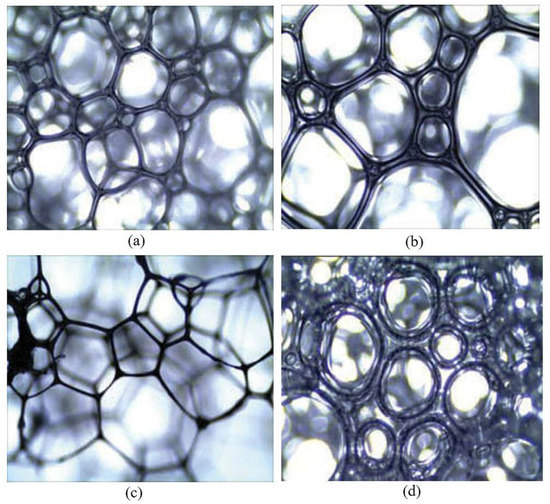 Figure 16. The microstructure maps of multi-phase foamed gel: (a) Without thickener and crosslinker; (b) only with thickener; (c) only with crosslinker; (d) both thickener and crosslinker [64].