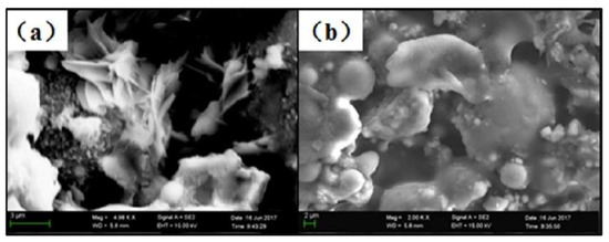 Figure 18. SEM image of fireproof material: (a) Hydrated product; (b) polymer film [74].