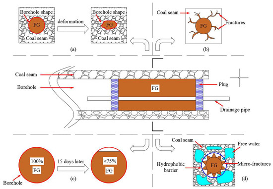 Figure 19. Sealing mechanism of the flexible gel (FG) for a borehole: (a) Borehole deformation adaptability; (b) high permeability; (c) preferable water retention; (d) hydrophobicity [83].