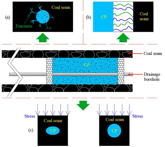 Figure 20. Sealing performance of composite polymer material (CP): (a) High fluidity and super sealing ability; (b) good combination with coal mass; (c) adapt to the deformation of borehole [85].