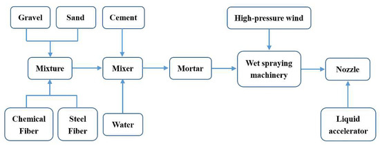 Unlike Australia, in view of the complexity of China’s mines, the metal mesh bolt support is still commonly used in coal mines. Only in stratified mining, some mines will use high-strength polyester fiber flexible mesh as false roof instead of the metal mesh [95]. Wet shotcrete, as a synergistic anchor net support way, is very popular in Chinese mines. In order to improve the low compressive strength, weak ductility and easy cracking of concrete itself, Qi [96] and others discussed the application of inorganic fiber concrete in coal mine roadways, which was based on cement slurry, mortar or concrete and was synthesized by adding metal materials, inorganic fibers or reinforcing materials. Fiber reinforced polymer has been used in concrete due to its light weight, high strength, corrosion resistance and fatigue resistance. A series of cement-polymer composite soft matters have been developed [97]. Xu et al. [98] applied chemical fiber wet shotcrete (Figure 22) in mine field. Polypropylene fibers and steel fibers were added to concrete. The length of polypropylene fibers was 30 mm, the density was 0.91 g/cm3, the tensile strength was 500 MPa, the tensile elasticity modulus was 7 GPa, the elongation at break was 8% and the equivalent diameter was 0.6 mm. The results showed that chemical fibers increased the toughness and tensile strength of concrete to a certain extent. After three months of roadway excavation, there was no cracking of slurry skin and the wet spraying effect of concrete was significant.