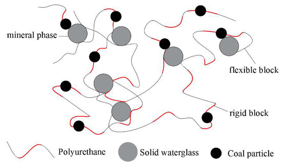 Due to the high cost of resin, organic and inorganic composite materials are typically produced. The excellent bonding property and high deformability of polyurethane (PU) and the low cost and high stability of sodium silicate (WG), means it is favorable to combine the two (PU/WG). Guan et al. [112] first added 50 g polyether polyol into 110.5 g sodium silicate and continued stirring until polyether polyols were completely dispersed to form emulsion. Then 60.5 g polymeric aromatic diphenylmethane diisocyanate (pMDI) was added. The polyurethane/sodium silicate adhesive solution was obtained by intense mixing. The compressive strength and flexural strength of coal/adhesives composition reached 21.4 MPa and 5.8 MPa, respectively. It is known that NCO groups in pMDI react with OH groups on coal surface first and then coal particles modified by NCO groups react with polyether polyols and sodium silicate, forming sodium silicate/polyurethane/coal compound. As shown in Figure 24, the obtained compound is composed of a polymer matrix and mineral phase. The structure of the polymer matrix is a combination of rigid and flexible blocks, coal particles are connected to polymer chains and solid sodium silicate is dispersed in the polymer network structure.