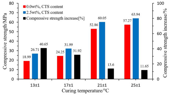 Figure 25. Compressive strength of the polyurethane (PU)/sodium silicate (WG)-0.0 wt.% and PU/WG-2.5 wt.% specimens at different curing temperatures for three days [113].