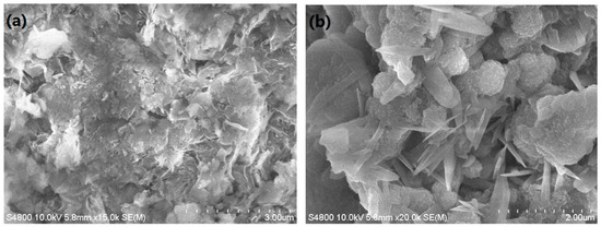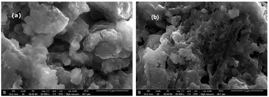Micrographs of the purified AC and Ln@AC nanocomposite are shown in Figure 2. It can be seen from that the AC consisted of small particles, thin sheets, layers, and a nonporous surface (Figure 2a). However, the introduction of Ln led to a well-developed coarse porous surface with irregular pores and breaks (Figure 2b). Moreover, compared to AC, the Ln@AC nanocomposite had more micropores and mesopores, indicating that the incorporation of Ln and AC can form numerous cavities and a relatively loose surface, and this intercalated–exfoliated hierarchical nanostructure results in the increased adsorption ability of Zn(II).