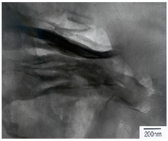 More direct morphological evidence of the Ln@AC nanocomposite was recorded by TEM. The combination of XRD patterns and TEM analysis is a powerful method when characterizing the hierarchical nanostructure of polymer/silicate clay nanocomposites. Figure 3 shows a TEM micrograph of Ln@AC. It was clear that the thin, dispersive, and dark lines were the intersections of AC sheets, while nanoplatelets and spaces between the dark lines were Ln chain molecules. Almost all of the Ln was embedded into the interlayer, expanding the hierarchical space of the AC. Organic polymers of Ln were well dispersed within the interlayers. This confirmed that the disordered intercalated–exfoliated hierarchical nanostructure of the AC still existed in the Ln@AC nanocomposite.