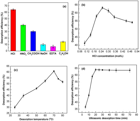 Various influencing factors on the Zn(II) desorption by the Ln@AC nanocomposite. (a) Effect of desorbed agents (dosage: 1 g/L; concentration: 0.25 mol/L; desorption temperature: 70 °C; time: 20 min). (b) Effect of HCl concentration (dosage: 1 g/L; HCl concentration: 0.10–0.50 mol/L; desorption temperature: 70 °C; time: 20 min). (c) Effect of desorption temperature (dosage: 1 g/L; HCl concentration: 0.25 mol/L; desorption temperature: 25–80 °C; time: 20 min). (d) Effect of ultrasonic desorption time (dosage: 1 g/L; HCl concentration: 0.25 mol/L; desorption temperature: 70 °C; time: 5–70 min).