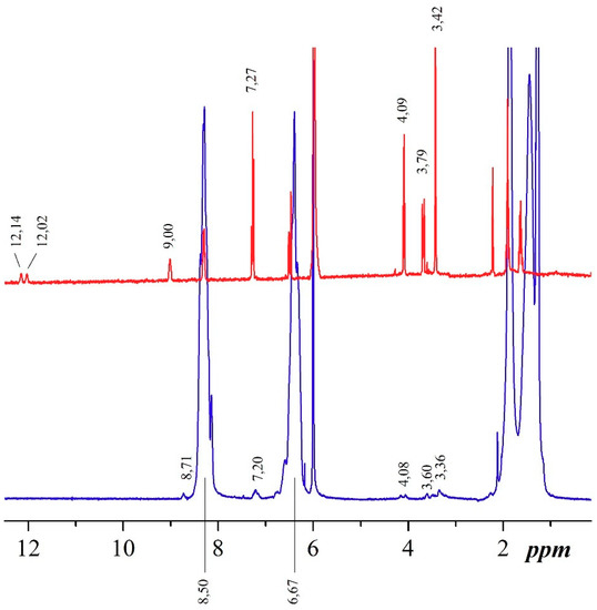 Figure 1. 1H-NMR spectrum of LB (red curve) and the correspondent metallopolymer PB (blue curve). The diagnostic resonances are evidenced.