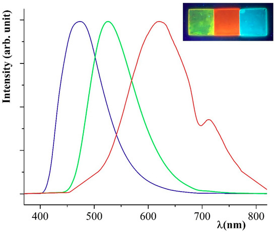 Figure 2. Normalized emission curves recorded on thin film (blue curve) samples of PB (blue curve), PG (green curve) and PR (red curve). In the inset: The same spin-coated thin films (respectively PG, PR and PB from left to right) photographed under the UV lamp at 365 nm.