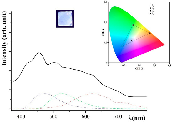 A suitable mix of the three different coordination moieties was realized by modulating the contents of the three emissive pendants. The emission in the solid state of the white polymer was realized in the stoichiometric ratio B/G/R = 1.95/0.15/1.05 in moles at 10% total grafting percentage (expressed as ligand/(ligand+PVPy)%.). The red emissive component must be carefully dosed because it causes a decrease in the PL efficiency of the whole system. The spin-coated thin film of PW under UV lamp at 255 nm is pictured in Figure 3 (inset). The fluorescence spectra of the same sample irradiated at 255 nm appear as a single broad band from about 350 to 700 nm. The point in the “RGB triangle” with CIE coordinates of (0.30, 0.31), shown in Figure 3 corresponds to the emission of PW, slightly shifted in the blue region, but highly efficient. PLQY measured on the polymer is 37%, to the best of our knowledge, this is an excellent value for a single-component white emissive material in the solid state [60,61,62].