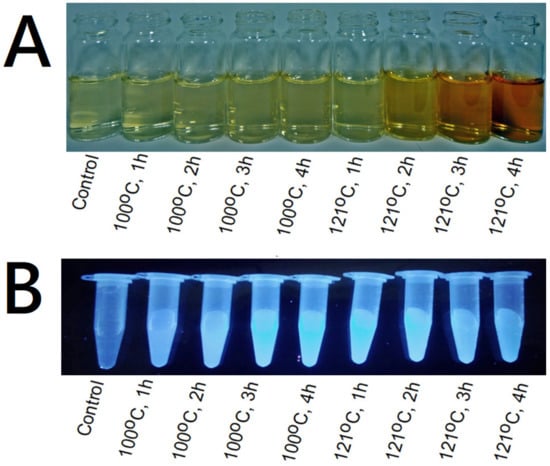 In the Maillard reaction, intermediates may express fluorescence ability [15]. As shown in Figure 2B, all the WSCGDs showed the fluorescence ability under UV light. This result confirmed that the Maillard reaction was being performed between water-soluble chitosan and glucose. A decrease in fluorescence ability of 121 °C at 3 h and 4 h could also be observed with the naked eye, indicating the final stage of the reaction, when the intermediates were transformed into final products.
