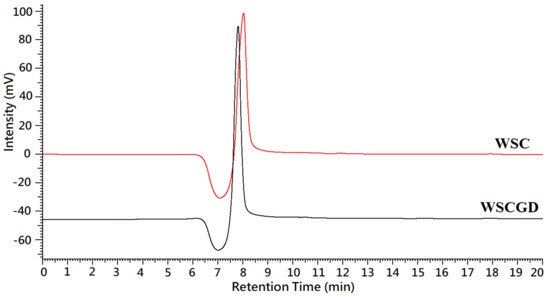 Typical high performance liquid chromatography size exclusion chromatography (HPLC SEC) profiles of WSC and WSCGD.