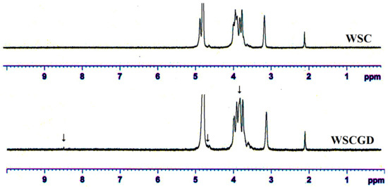 Typical 1H-NMR profiles of WSC and WSCGD. ↓ indicating the difference in 1H-NMR signal of WSCGD comparing to that of WSC.