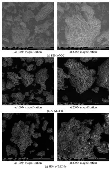 In order to analyze the morphological characteristics of GC, TC, MC-Br, MC-g-PMA, and MC-g-PAA, before and after adsorption of Pb2+, their images were obtained by a SEM (INSPECT S50, FEI Company, Hillsboro, OR, USA) at 10 kV accelerating voltage, at 2000× magnification.