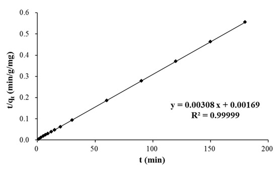 where (g/mg/min) represents the adsorption rate constant of the pseudo-second-order model. The values of and were evaluated from the slope and intercept of the linear plot between and .