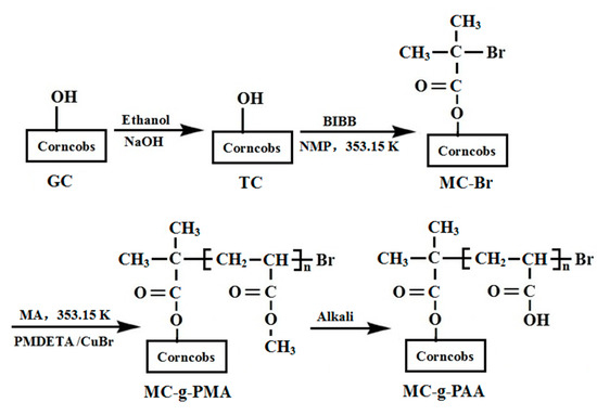 Atom transfer radical polymerization (ATRP) is a controlled radical polymerization method that has been developed in recent years [5,6,7,8], and has been extensively investigated for grafting polymers onto substrates to increase active functional groups [4,9,10,11,12]. A great many modified adsorbents via ATRP such as functionalized cotton [9,10], aminated resin [11], triethylene-tetramine grafted magnetic chitosan [12], and poly (methacrylic acid)-grafted chitosan microspheres [4] have been investigated for their adsorption of different heavy metal ions. The results [4,9,10,11,12] showed that the adsorption capacities of these modified adsorbents were significantly improved due to introducing brushes with dense and active functional groups. Recent studies on carboxylate-functionalized adsorbents [4,7,13,14] have revealed that carboxylic groups (–COOH) have a strong adsorption affinity of metal ions, which can significantly improve the adsorption capacities of the adsorbent for metal ions. Therefore, it would be ideal if corncobs could be functionalized by introducing polymer brushes with dense and active carboxyl groups (–COOH).