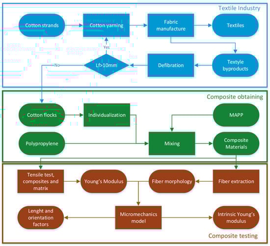 Figure 1 shows the workflow for the research, from the production of cotton flocks by the textile industry to the measurement and evaluation of the mechanical properties.