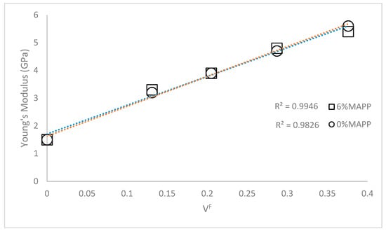 The Young’s modulus of a semi-aligned short fiber reinforced composite is mainly affected by the properties of the phases and its contents, the morphology of the reinforcement, its mean orientation, and its grade of dispersion. In the case of a correctly dispersed reinforcement, the increase of the Young’s modulus against reinforcement content was expected to be linear (Figure 2) [32].