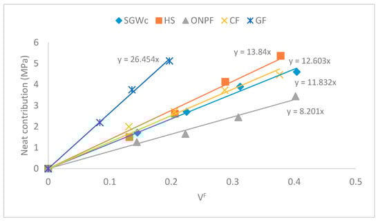 Then, if the neat contribution is represented against the reinforcement volume fraction, a regression line is obtained, and the slope of such a line has been referred to in the literature as a fiber tensile modulus factor (FTMF) [6,32]. This factor can be used as a measure of the stiffening capabilities of a reinforcement. Figure 3 shows the FTMF for different fibers as polypropylene reinforcement.