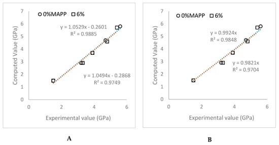 The regression lines for the uncoupled and coupled composites using the experimental and theoretic values (Figure 4A) show 1.05 slopes, with a high correlation. This slope shows a high coincidence between the computes and experimental values. A second regression line was proposed, passing thorough the origin (Figure 4B). In this case the slopes were found to be 0.99 and 0.98 for the uncoupled and coupled composite, respectively. As mentioned above, these results prove the accuracy of the values predicted from the model. The values also prove the impact of the morphology of the reinforcements in the Young’s moduli of the polymers, as Tsai and Pagano model uses these values as the input.
