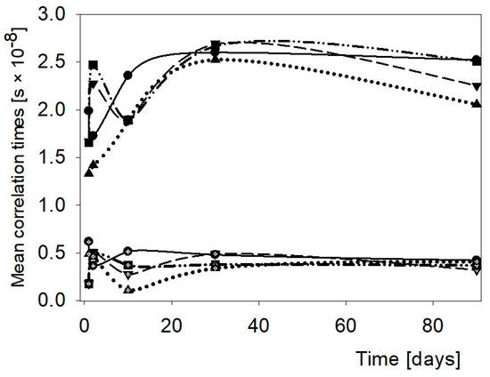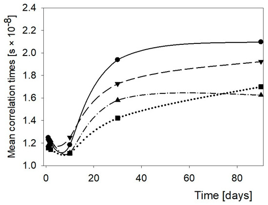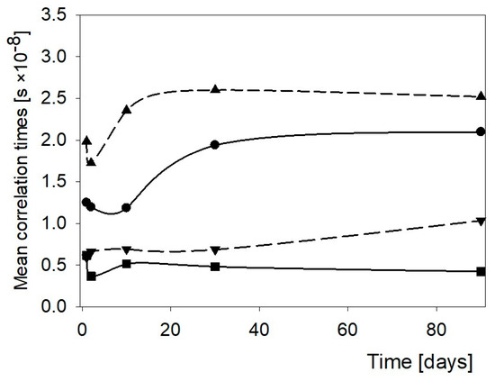 As it can be seen in Figure 1, there were two mean correlation times for the HCS paste, that is, one related to bound water, s, and the other to bulk water, l. Changes of τc over time in pastes of NCS and the s fraction of HCS had the same character. τc for the s fraction was shorter indicating a more solid state character of this fraction. The l-fraction had a liquid character. Corresponding values of that parameter were lower than these for WCS. In the liquid fraction of HCS system, changes were observed during the first 10 days. Analysis of the changes in τc for pure corn starch pastes under study revealed that the changes proceeded in three characteristic periods. Initially, within a few days microviscosity of pastes of NCS and HCS declined. In the WCS paste such an effect did not appear. Thus, a conclusion could be drawn that amylose chains had the greatest effect on short-time changes. Within 30 subsequent days molecular dynamics of water in every paste changed the most significantly regardless of the starch variety. They were most remarkable in the paste of NCS and in the s-fraction of the WCS paste. Changes in the l-faction of the latter paste were subtle. On storage longer than 30 days, the network structures stabilized.