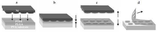 Schematic illustration of: (a) the assembly of poly(vinyl alcohol) (PVA) substrate film, a biodegradable PLGA device film, and a polytetrafluoroethylene (PTFE) film prior to the fabrication process; (b) hot punching is performed by applying pressure and heat; (c) a demolding step of the Ni stamp is completed, leading to separation of PLGA microcontainers from the surrounding film; (d) mechanical peeling of the surrounding PLGA film.