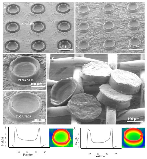 First, the fabrication of PLGA microcontainers by hot punching had to be optimized. The PLGA film was molded and finally punched due to shear stress at the highest protrusion of the stamp, which exceeded the ultimate tensile strength of the material, as shown in Figure 2a. By the addition of the PTFE film between the stamp and the PLGA device film, it was possible to avoid adhesion between the stamp and the PLGA device film upon demolding. After the hot punching process, the sacrificial PTFE film could easily be peeled off. The microcontainers were physically separated from the surrounding PLGA and remained on the underlying PVA substrate, as shown in Figure 2b–d. Microcontainers were successfully fabricated with PLGA 50:50 and 75:25 in arrays of 20 × 20 devices in a single-step hot punching process. The PVA substrate was dissolved in aqueous medium and the microcontainers were harvested on a grid, showing good structural definition and integrity, as shown in Figure 2e. SEM images revealed an excellent replication fidelity. The inner and outer diameter were 240 ± 2 µm and 275 ± 0.5 µm, respectively, the height was 73 ± 6 µm, and the reservoir depth was 56 ± 1 µm as investigated through optical profilometry and shown in Figure 2f,g. Compared to the PCL microcontainers fabricated with the identical Ni stamp [12], it was observed that the PLGA microcontainers were slightly lower. This was attributed to the PTFE film added during the hot punching step, which was not required for PCL. The inner diameter was 10 µm larger for PLGA microcontainers compared to PCL, which was expected as the PFTE had enlarged the stamp features. This led to different volumes of the PLGA and PCL microcontainers of 1.8 and 3.8 nL, respectively. The weight of a single microcontainer was determined experimentally by weighing a defined amount of devices. For PCL, the weight was 3.7 ± 0.4 µg, PLGA 50:50 had a weight of 2.7 ± 0.4 µg, and PLGA 75:25 weighed 3.6 ± 0.04 µg. This was in good agreement with the values estimated based on the measured dimensions and the polymer density.