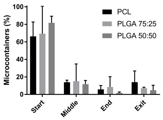 Percentage of microcontainers located in the start, middle, end, and exit of the small intestine of a pig after an ex vivo perfusion study. Comparison of poly-ɛ-caprolactone (PCL) (black) microcontainers, PLGA 75:25 (dark grey), and PLGA 50:50 (light grey). Data is presented as mean ± SD with n = 3–4.
