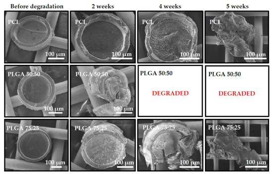 The morphology of the microcontainers was analyzed by SEM before and during degradation in FaSSIF with pancreatin, as seen in Figure 4. PLGA 50:50 microcontainers already showed signs of degradation and loss of structural integrity in the first SEM analysis after two weeks. In comparison, PLGA 75:25 and PCL microcontainers only had minor deformation of the microcontainer walls in both cases. After four weeks, PLGA 50:50 microcontainers were completely degraded and thus, could not be detected anymore via SEM inspection. At the same time, PLGA 75:25 and PCL devices showed clear signs of degradation by changing structural integrity and even breaking apart. After five weeks, the morphology of those microcontainers had completely changed and only small polymer lumps remained. Finally, after six weeks, none of the three polymers could be detected through SEM. The observed degradation for all three polymers was faster compared to what would be expected from typical degradation studies reported in the literature. For PCL in an aqueous environment without any enzymes, degradation is typically slow, which would not allow complete degradation of the microcontainers within six weeks [14,15]. This is also supported by the fact that PCL microcontainers immersed in FaSSIF medium without enzymes were completely unaffected after 20 d, as shown in Supplementary Materials S1. The porcine pancreatin added in the FaSSIF medium contains a mixture of enzymes, including lipase, which readily hydrolyzes ester bonds in polyesters [23]. Furthermore, PCL is generally known to be degraded by microorganisms, as well as by hydrolytic mechanisms, under physiological conditions [25]. PLGA has been proposed to degrade primarily through hydrolytic degradation, but it has also been suggested that enzymatic degradation may play a role in the process [26,27]. Among all the tested polymers, PCL seemed to have the slowest biodegradation rate and literature also evidences that it is a slower degrading polymer in comparison to PLGA [26]. Regarding the difference between PLGA 50:50 and 75:25, it was expected that the degradation time would vary as different ratios of the monomers have a significant influence on hydrolysis and enzymatic degradation. PLGA 50:50 is expected to have the highest degradation rate compared to PLGA 75:25, which typically is approximately twice as slow due to the higher content of hydrophobic groups [27]. This corresponds well to what was observed during the degradation study. It should be noted, that in vivo degradation would be expected to occur even faster due to presence of bacteria and other enzymes in the GI tract.