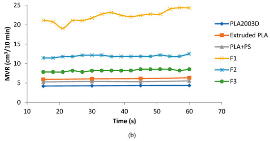 The trend of the torque decreased as a function of time, due to the addition of plasticizer in the blends; on the other hand, PS enhanced the melt viscosity stability (Figure 1a). The trend of the MVR better showed the difference between F2 and F3. It can be seen how the plasticizer alone makes the trend unstable. The simultaneous addition of PS and calcium carbonate leads the material to have a trend similar to the pure extruded PLA (Figure 1b).
