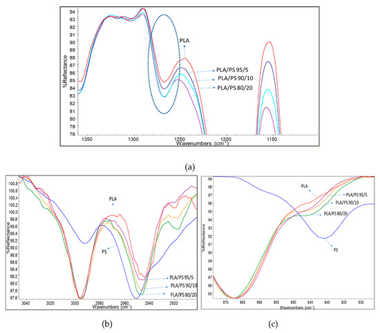Films were characterized by infrared spectroscopy in ATR mode (Figure 2). According to Meaurio et al. [63], in the region characteristic of the stretching of the C–O group between 1200 and 1300 cm−1, it is possible to observe the band attributable to the amorphous fraction of the PLA (Figure 2a). The pure PLA spectrum showed the less intense band in this range. By increasing the amount of PS acrylic copolymer-based product in the blend the band intensity increased, revealing the increase of the amorphous fraction in PLA. The presence of PS seems, thus, to obstacle the PLA crystallization, because of its homogenous distribution in the film. Thus, despite its low content (2%), the presence of the acrylic chains has a significant effect on chains mobility.