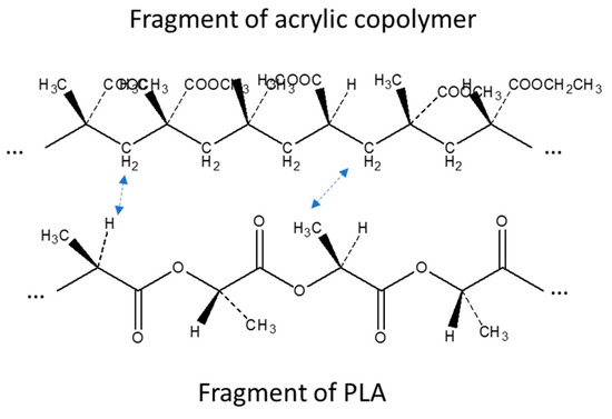 Other interesting changes with respect to the PLA spectrum, not simply explainable by the superimposition of PS acrylic copolymer bands, were found in the CH stretching region (Figure 2b). In fact, although in this part of the spectrum signals are weak, the addition of PS slightly shifted the peak relative to the asymmetric stretching of CH2 from 2945 cm−1 of pure PLA to 2950 cm−1 of the melt enhancer, indicating some possible interactions of the CH2 of PS with the CH3 of PLA. Moreover, the weak peak at 2920 cm−1, attributable to the stretching of the C–H group of PLA, was slightly shifted to lower wavenumbers, due to the presence of increasing amounts of PS. In Figure 2c, on the other hand, it is possible to observe how the rocking CH2-related shoulder of PS [64] moves towards lower wavelengths by increasing the percentage of PS in the mixture. As the carbonyl bands at 1745 cm−1 did not show peculiar shift, due to the addition of PS, and also the typical bands of C-O did not show appreciable changes, this study confirms that PLA interacts with PS acrylic copolymer because of the peculiar structure of this copolymer, having polar groups on one side and non-polar CH on the opposite side with respect to the polymer chain (Figure 3). This result is quite surprising, because electronegative oxygen atoms are present in macromolecules, and polar bonds are stronger than van der Waals bonds; hence, the dipole interactions between macromolecules should be not negligible. We can tentatively explain this result considering that these kinds of dipole-dipole interactions between a PLA and a PS macromolecule are very similar to the inter-macromolecular interactions occurring between two PLA macromolecules or two PS macromolecules, whereas, the interactions between CH, CH2 and CH3 groups can be much affected by the specific orientation of groups with respect to the main carbon chain in PS acrylic copolymer and PLA chains (Figure 3).