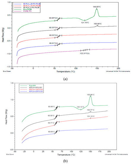 Comparison between the second heating thermograms of the (a) PLA/acrylic copolymer-based product (PS) cast films; (b) PLA/PS cast films treated for 2 min at 190 °C. Exothermal peaks are directed down.