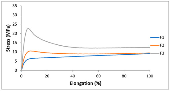 The first part of stress/strain curves (up to 100% of elongation) of F1, F2, F3.