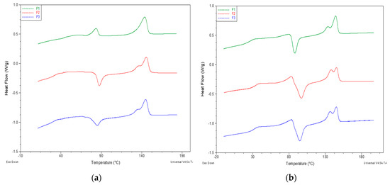 DSC heating thermograms of F1, F2 and F3: (a) First heating; (b) second heating. Exothermal peaks are oriented down.