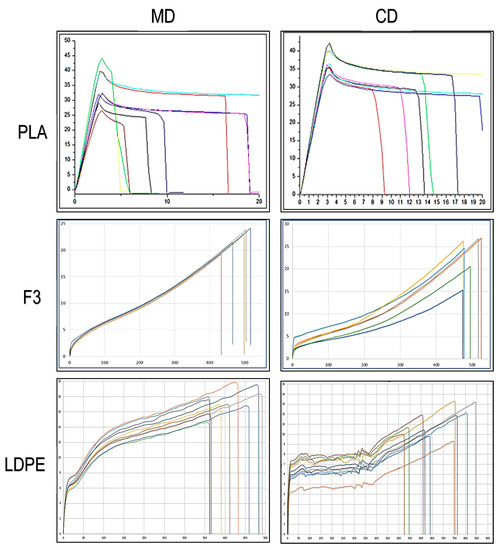 From the materials prepared by Mini-extruder, films were prepared by compression molding starting from the flat wire recovered by the micro-compounder and pressing them at 180 °C for 30 s without applying any additional pressure and cooling with compressed air. In this way, the direction of preferential orientation given to the material by the extrusion was preserved to simulate in the tensile test the behavior of the film obtained in flat die extrusion. Tensile tests, performed on ISO 527-2/5A dumbbell specimens obtained with a Manual Cutting Press EP 08 (Elastocon, Brahmult, Sweden) were carried out in machine direction by an Instron universal testing machine model 5500R (Canton, MA, USA). The machine was equipped with a 100 N load cell, compressed air grip and interfaced with a MERLIN software (INSTRON version 4.42 S/N–014733H). The initial grip separation was 25 mm, and the deformation rate was set at 100 mm/min.