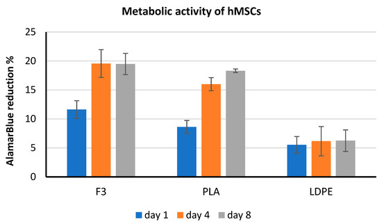 AlamarBlue® test was performed under UV-VIS spectrophotometry at days 1, 4 and 8 to monitor hMSC viability in 24 well plates (n = 6) following the manufacturer’s instructions [56].