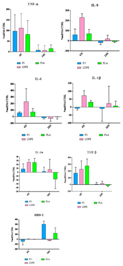 HaCaT cells were incubated with the films for 6 h and 24 h. At the end of the experiment, the mRNA was extracted from the cells and the levels of expression of the proinflammatory cytokines, interleukins (IL)IL-8, IL-6, IL-1α IL-1β and tumor necrosis factor alfa (TNF-α), the anti-inflammatory cytokine transforming growth factor beta (TGF-β) and the antimicrobial peptide human beta defensin 2 (HBD-2) were evaluated by Real-Time polymer chain reaction (PCR).