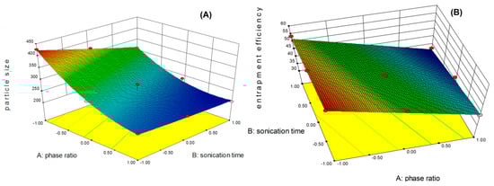 The equations represent the quantitative effect of variable (A, B) and their interactions on the responses. Coefficients with more than one factor term and those with higher order terms represent interaction terms and quadratic relationships, respectively. A synergistic effect is represented by a positive trend while an antagonistic effect is represented by a negative trend. The interactions between factors and the responses were further studied by using the contour plot and the 3D response surface plot (Figure 3). It is evident from the plot that both particle size and encapsulation efficiency decreased as the aqueous-to-oil phase ratio increased. Similarly, an increase in the sonication time also led to a decrease in the particle size, as well as the encapsulation efficiency, but the effect was slightly lower when compared to the phase ratio.