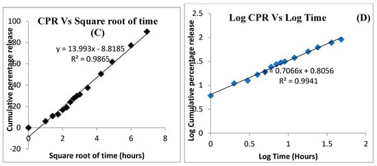 Kinetic assessment of drug release from Tf-conjugated PLGA NPs using various kinetic models: (A) zero-order kinetics, (B) first-order kinetics, (C) Higuchi’s model, and (D) Korsmeyer–Peppa’s model.