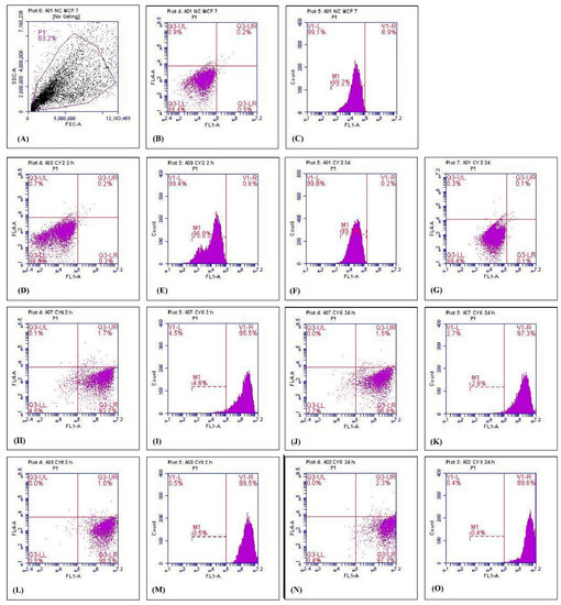 The MCF-7 (1 × 106) cells were seeded in 96 well plates and incubated at 37 °C for 24 h in a humidified CO2 incubator. After 24 h of incubation, the medium was aspirated from the plates, and cells were washed with DMEM. A volume of 10 µL of nanoparticles conjugated with coumarin-6 (at their respective IC50 concentrations) were incubated at 37 °C in the CO2 incubator (for 2 h and 24 h). The formulation in the medium was then aspirated, cells were washed thrice with PBS and scraped in 1 mL of fresh PBS using a cell scraper. The cells were analyzed using Accuri C6 flow cytometer (BD Biosciences, San Jose, CA, USA) excitation at 488 nm and emission at 533/30. A minimum of 10,000 events were recorded and analysis of flow cytometric data was performed using BD software. The first gating was done for a single cell population selection on a forward (FSS) versus side scatter (SSC) dot plot. The second dot plot was FL-1-A versus FL-4-A (533/30 versus 675/25) for selection of coumarin-6 fluorescence in the FL-1 channel. Plain normal cells were used for the normalization of the internal fluorescence or auto-fluorescence. The shift in mean fluorescence in FL1-A versus count plot was calculated [48].