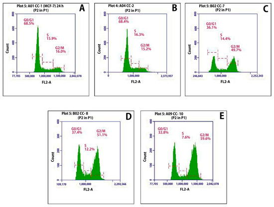 The MCF-7 (1 × 106) cells were seeded in 25 cm2 flasks and after overnight adherence, incubated for 24 h with test formulations at their respective IC50 concentrations. Trypsinization was used to detach the cells followed by mixing with floating cells, centrifuged and PBS washed. The obtained cell pellets were fixed in 70% ice-cold methanol for 24 h at −20 °C. Cell pellets were washed with PBS and isotonic PI solution (25 µg/mL propidium iodide, 0.03% NP-40 and 40 µg/mL RNase A) was added. The Accuri C6 flow cytometer (BD Biosciences, San Jose, CA, USA) was used for the analysis of stained cells, applying 488 nm excitation and emission at 575/40 nm. A minimum of 10,000 events were recorded for each sample, and data analysis was done using BD Accuri™ C6 software [49,50].