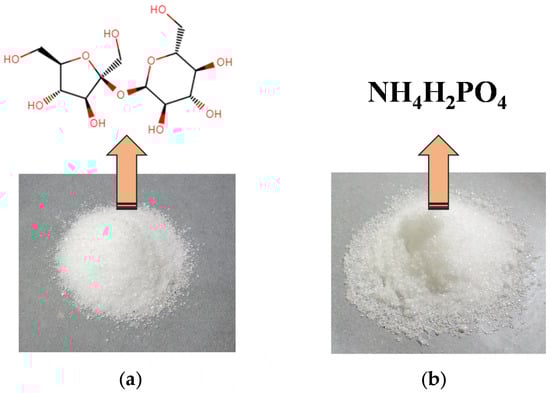 Appearance and chemical formula of (a) sucrose and (b) ammonium dihydrogen phosphate.