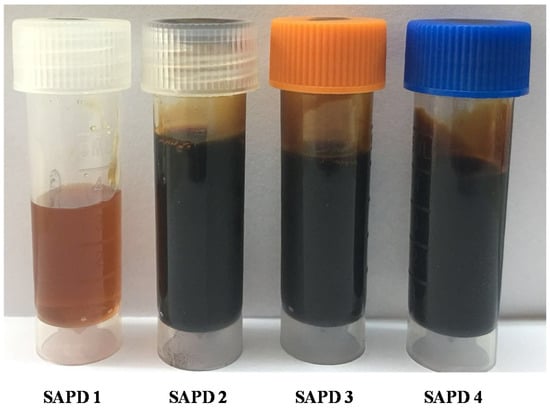 Sucrose and ADP were first mixed with an 85/15 proportion, and then were translated to 5.7 parts sucrose per 1 part ADP. These reagents were next poured into a three mouthed bottle with distilled water. The weight with distilled water included was calculated based on the water solubility of sucrose at 90 °C [27] (Equation (1)). This mixture was then heated in an oil bath at 90 °C for certain time while it was sheared at 180 rpm/min to facilitate synthesis of the sucrose-ADP (SADP) adhesive. The pH of the adhesives was measured at 30 °C using a Leici pH meter PHBJ-206 (Leici, Shanghai, China). The viscosity of the adhesives was measured using a HAAKE rotational rheometer MA S60 (HAAKE CO., Karlsruhe, Germany). Specifically, 2 mL of each adhesive were loaded onto a flat plate set at 30 °C. The measuring geometry (C60 2°/Ti-02170027) was next lowered, and the testing mode was CR using 100/s shear rate. Each viscosity test experiment lasted 300 s until the viscosity values stabilized. A total of 80 viscosity measurements were acquired over the duration of analysis, while the final viscosity was defined as the average values of last 40 data points. The results of pH and viscosity are shown in Table 1. The appearance of synthesized SADP adhesives is shown in Figure 2. All the synthesized SADP adhesives were sealed and stored at room temperature for at least three days before further research was conducted involving them.