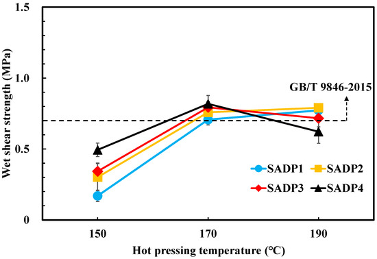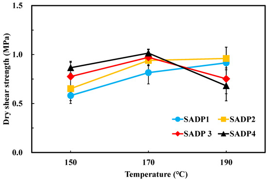 To evaluate the bond performance of SADP adhesives, three-ply plywood was fabricated using the synthesized SADP adhesives, and the results of dry and wet shear strength are shown in Figure 3 and Figure 4. The profiles visualized in both figures show that the shear strength of the boards bonded with SADP 1 and SADP 2 exhibited a positive relationship with hot pressing temperature. However, the plywood manufactured using SADP 3 and SADP 4 shows a negative correlation trend at 190 °C, which was observed as a decrease in the mechanical properties compared with the boards bonded at 170 °C. Considering the results shown in Table 3, both the dry and wet wood failure of the boards bonded with SADP 3 and SADP 4 at 190 °C was 90 and 100%, respectively. This performance result indicates that the reason that the shear strength reduced for these two adhesives could be due to decreasing veneer strength. This could be related to the pH values of SADP 3 and SADP 4, measured as 2.35 and 2.01, respectively. This lowered pH may have caused the liberation in the liquid resin of phosphoric acid and pyrophosphoric acid produced from the ADP [28], two components that can deteriorate the wood elements at the high pressing temperatures that were investigated [29]. Regarding wet shear strength, the average values of all the samples hot pressed at 170 °C satisfied to the China National Standard (GB/T 9846-2015). It could be found that the maximum wet shear strength was obtained from SADP 4 (0.82 MPa), and variance analysis (ANOVA) revealed no significant (p > 0.05) difference of wet shear strength between SADP 3 and 4 hot pressed at 170 °C; however, although ANOVA analysis showed a significant difference between SADP 2 and the maximum values, judging from the holistic performance of the plywood bonded with SADP adhesives and the pH values of each adhesive, the optimal synthesis time and hot pressing temperature in this study are considered as 2 h and 170 °C, respectively.